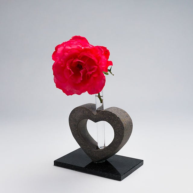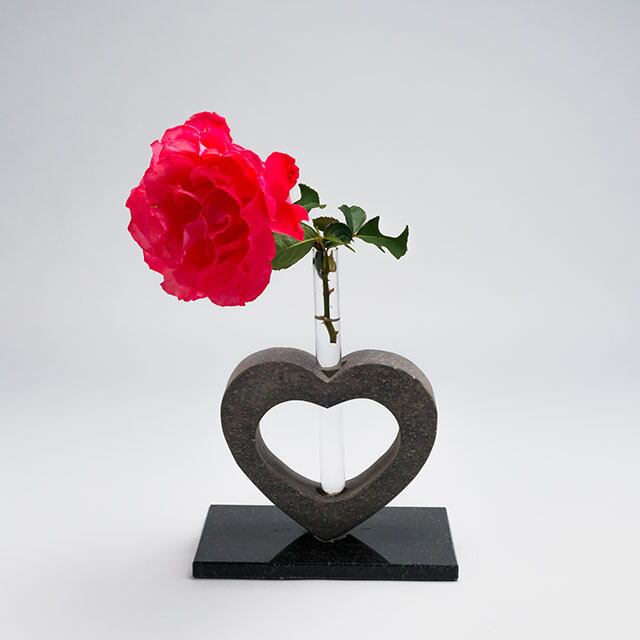 ハートがかわいい一輪挿し。石に試験管を差し込んであり、そこに花を一輪挿すことができます。茎が浮かんでいるように見えるモダンなデザインの一輪挿しは、シンプルなインテリアに似合います。