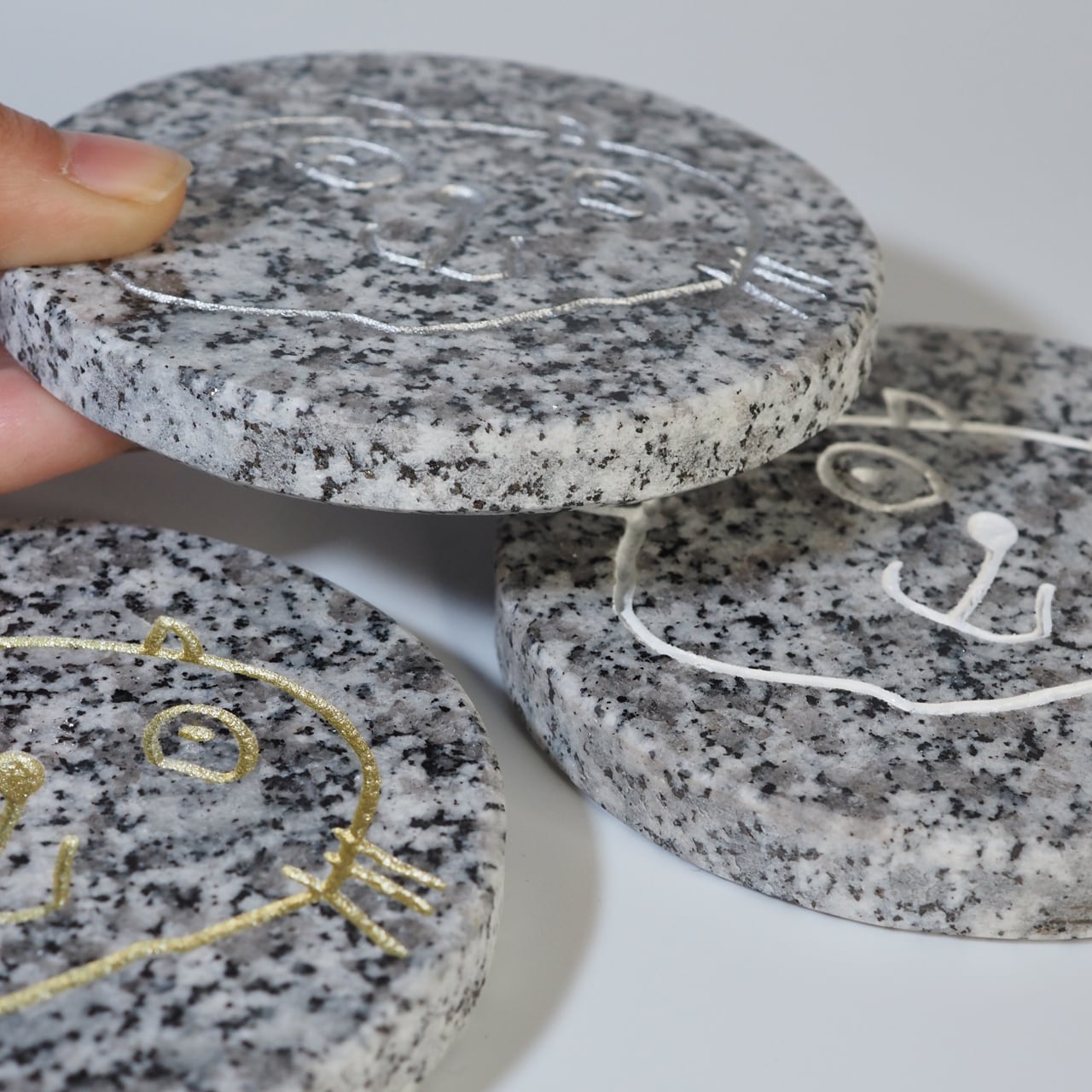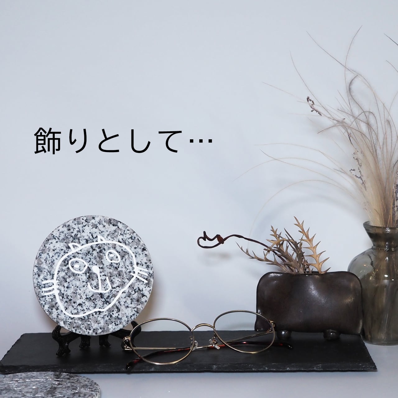 この直径10cmのサイズは、飾るだけではなく、コースターやペーパーウェイトとして日常生活で使っていただけます。絵の描かれた元の紙切れだとそうはいかないですよね…。頑丈な石だからこそ、気兼ねなくどんどん使って下さい。
